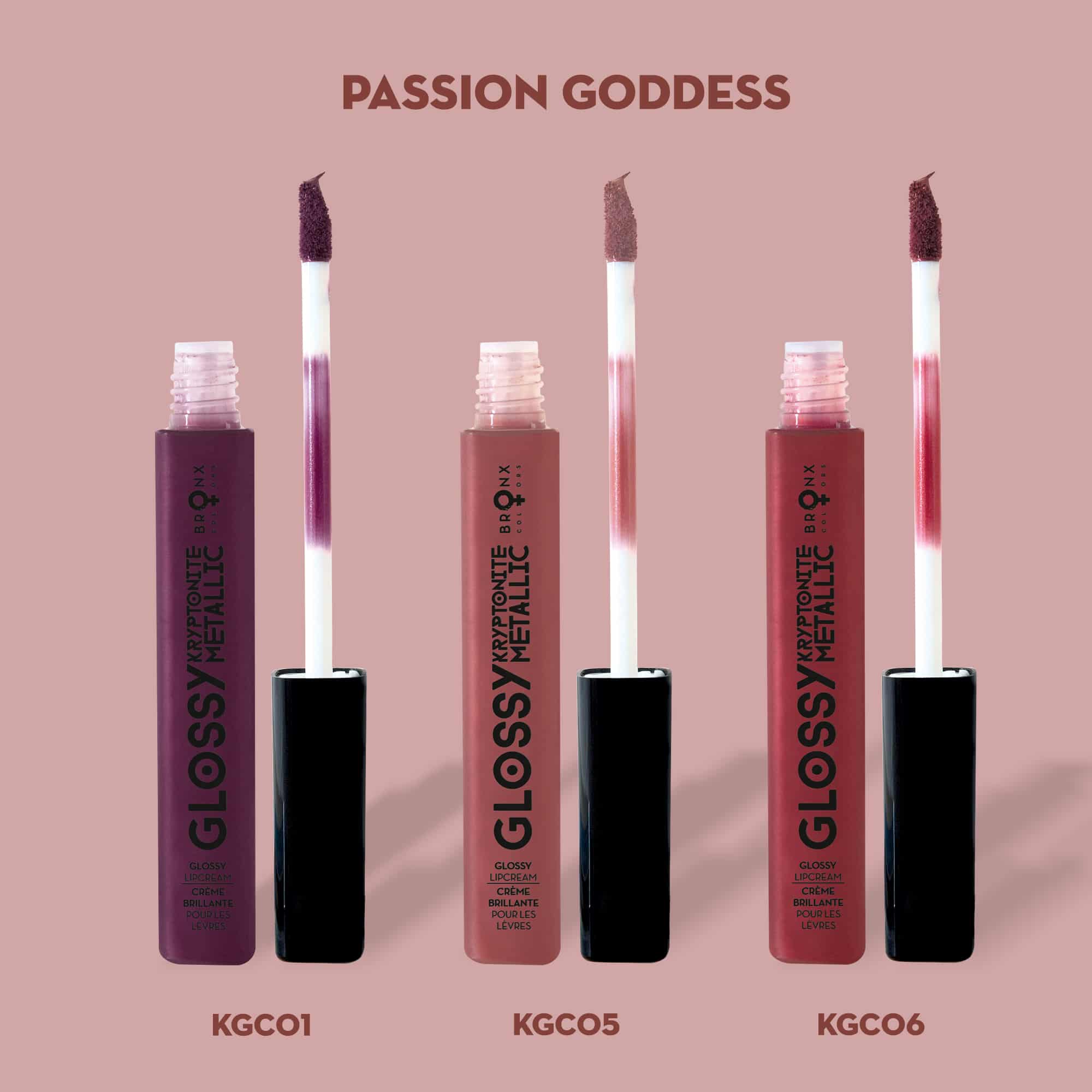 Das Passion Goddess Bundle enthält 3 hochdeckende und reichhaltig pigmentierte Glossy Lip Creams: KGC01, KGC05, KGC06. Die cremige Textur gleitet perfekt auf die Lippen und bietet eine intensive Pigmentierung, die stundenlang anhält. Sie kombiniert die Farben, die nur eine Göttin tragen würde!