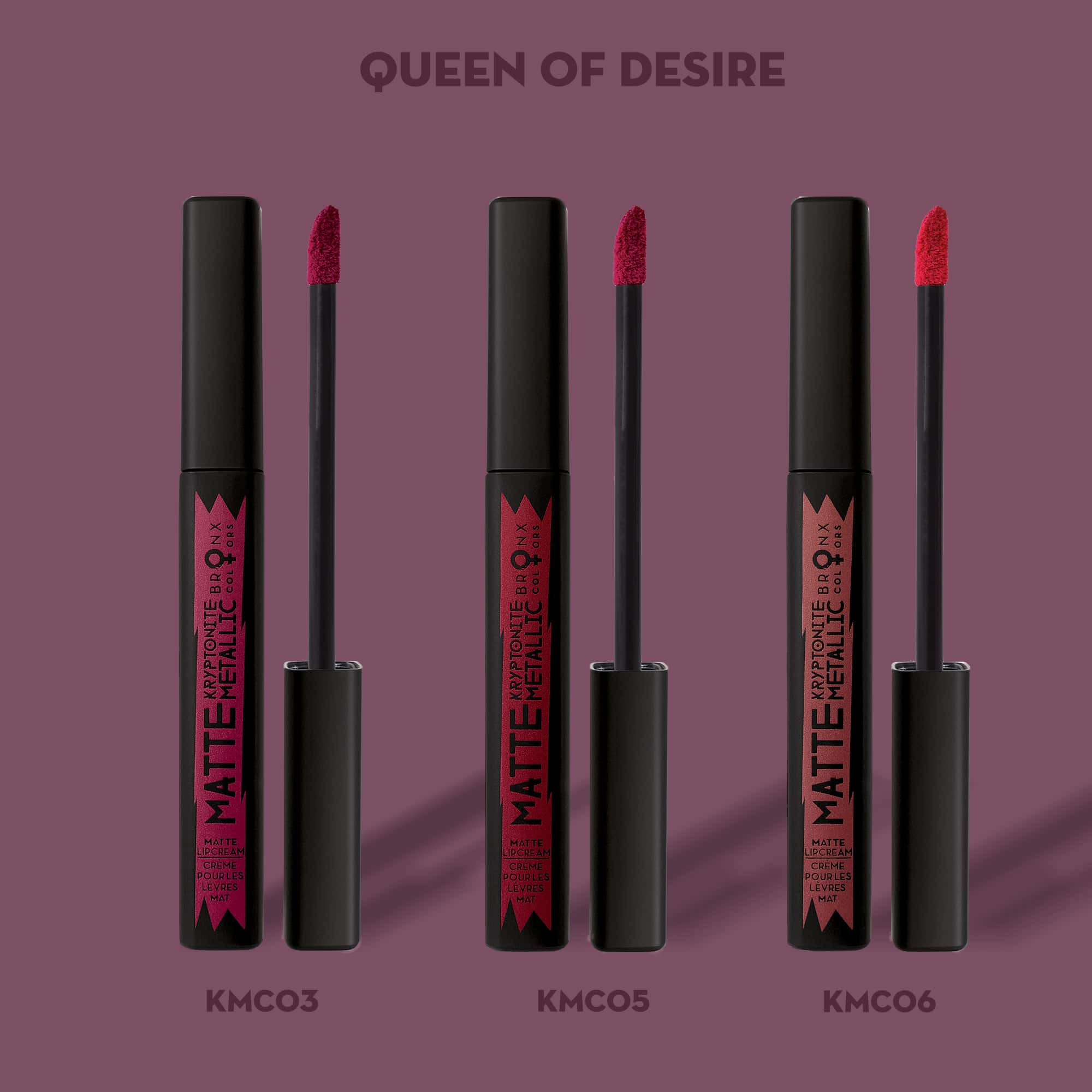 Das Queen of Desire Bundle enthält 3 hochdeckende und reichhaltig pigmentierte matte Lippencremes: KMC03, KMC05, KMC06. Die cremige Textur gleitet sanft über die Lippen und sorgt für ein perfektes, mattes Finish, das stundenlang anhält. Sie kombiniert die Farben, die nur eine Madam tragen würde!