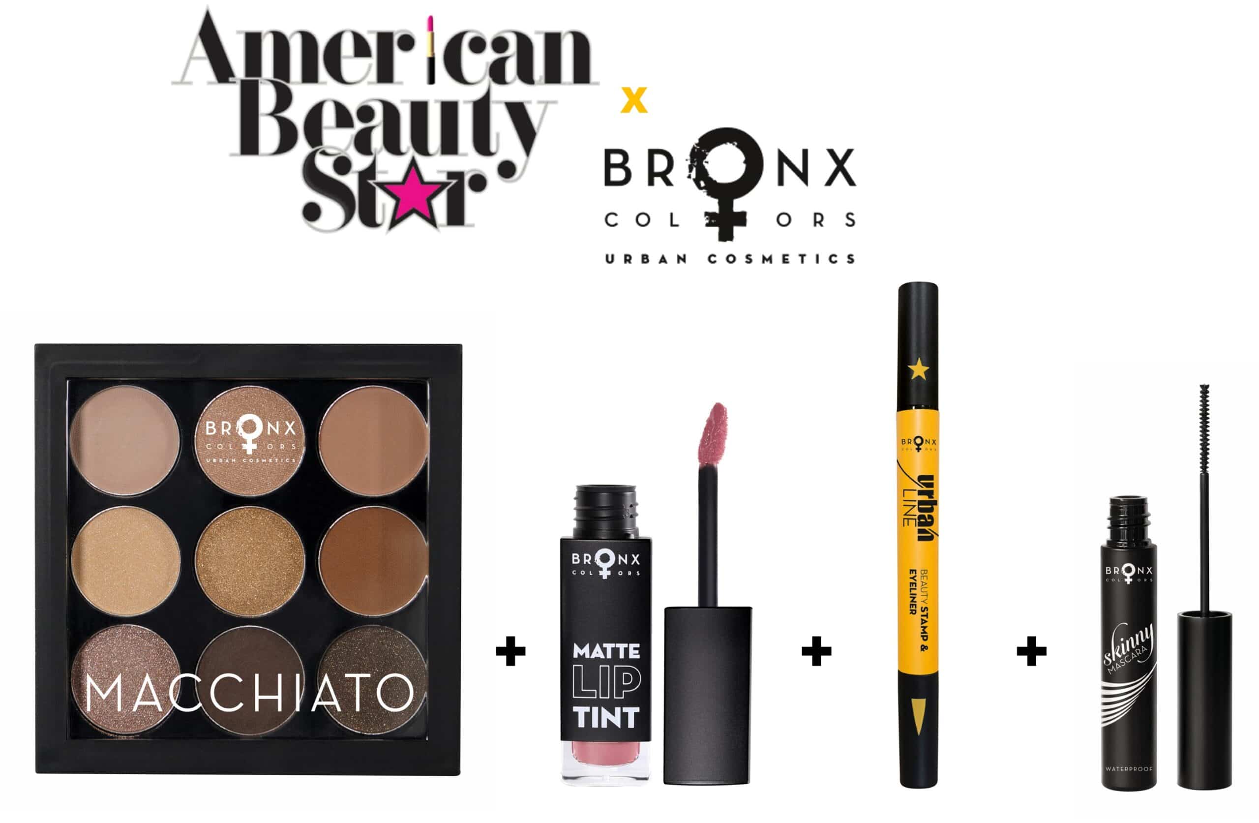 MACCHIATO EYESHADOW PALETTE in 9 wonderful nude beige and brown shades, MATTE LIP TINT, SKINNY MASCARA with the precise Micro Brush applicator, URBAN BEAUTY STAMP & EYELINER 2 in 1 Felt Tip Liner with Tattoo stamp from the City where Stars are born.
